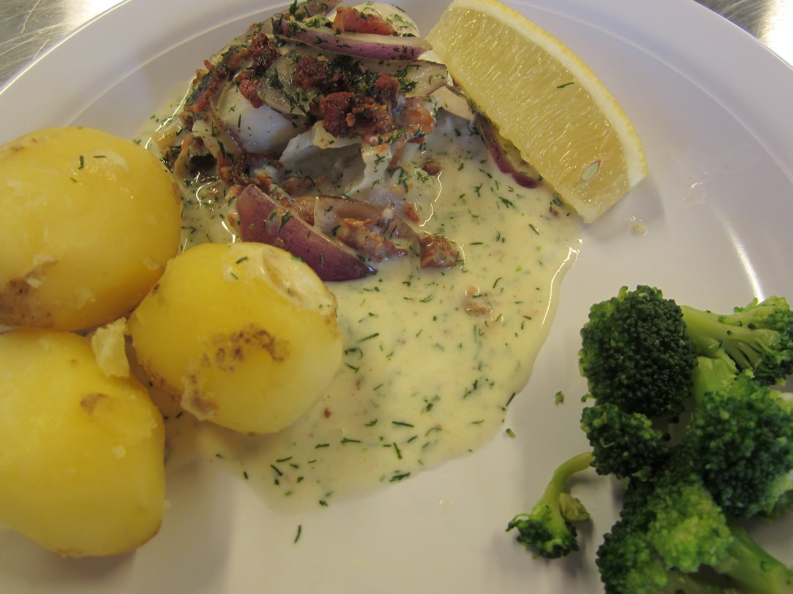 Fisk igen!!?? Jaa igen, svarade vi i kör i köket.Vi serverar fisk en gång i veckan, och en vecka går ju väldigt fort som ni vet. Det var många positiva superlativ idag.Tänk vad lite baconströssel kan göra. Det blir spännande och annorlunda och en riktig bra smakförstärkare.